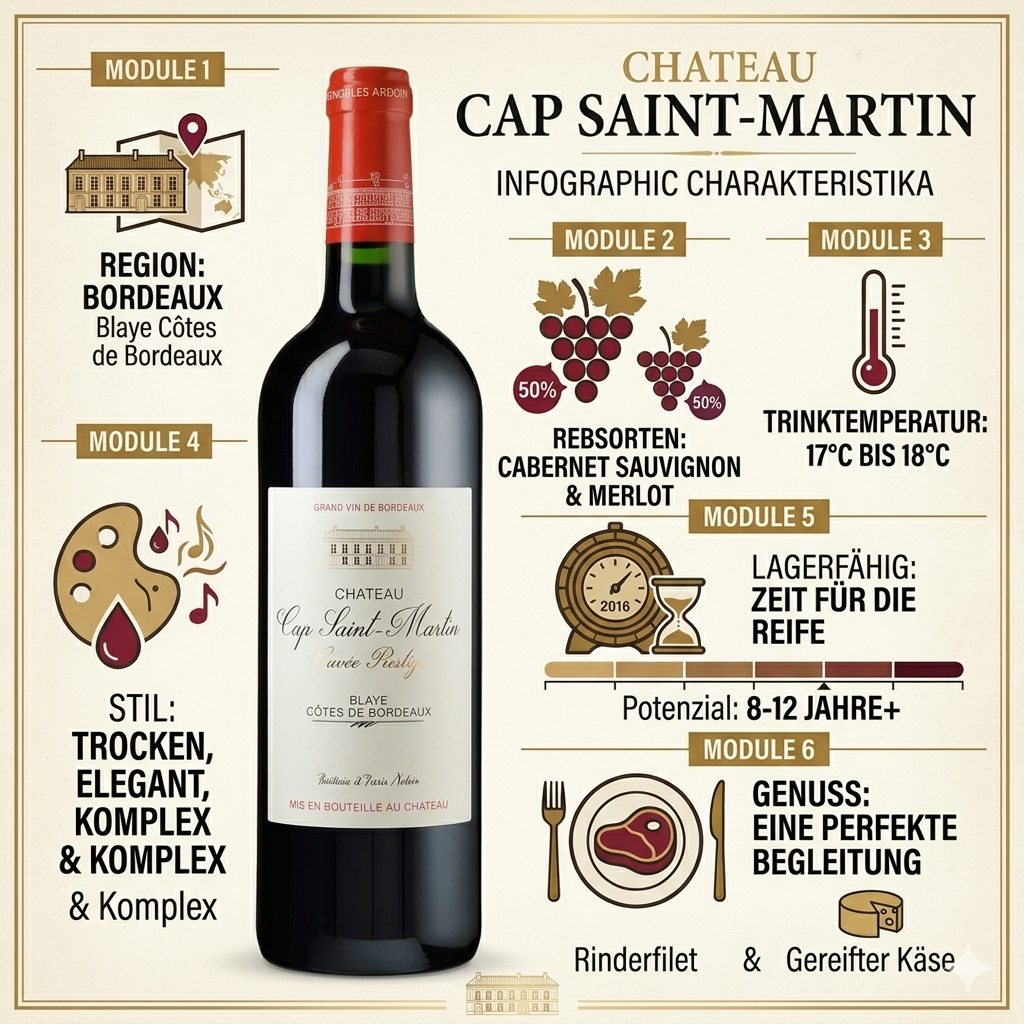 Tauchen Sie ein in die Welt der feinen französischen Weinkultur. Der Cap Saint-Martin aus der exklusiven Cuvée Prestige ist ein Paradebeispiel für die Handwerkskunst aus dem Herzen des Bordeaux. Dieser trockene Rotwein vereint Tradition mit moderner Finesse und ist die ideale Wahl für alle, die einen Wein mit Charakter und Geschichte suchen.